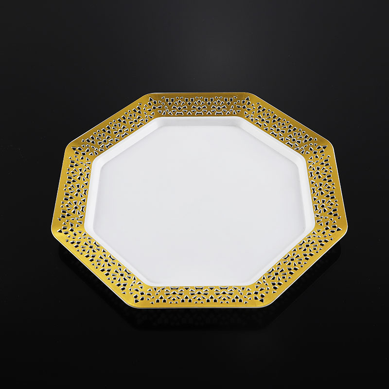 Zhejiang Yibo Technology Co., Ltd é um fabricante e fornecedor de talheres de plástico em grande escala na China. Esta placa octogonal de plástico com borda metálica brilhante está disponível em uma variedade de opções de personalização de cores. A placa octogonal de plástico com borda metálica brilhante é altamente resistente à corrosão e pode ser colocada em uma variedade de alimentos diferentes.